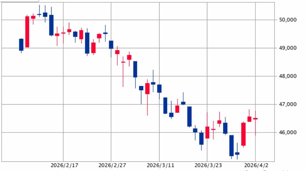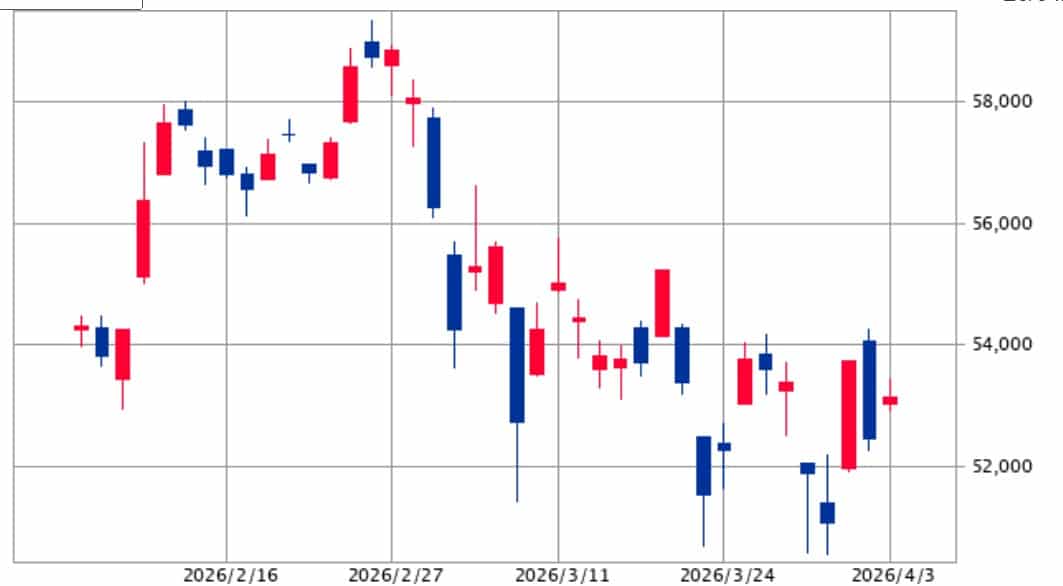 5万円割れ近くまで下げたのですが、また1日で戻し、また暴落といった乱高下が続いていますね。
