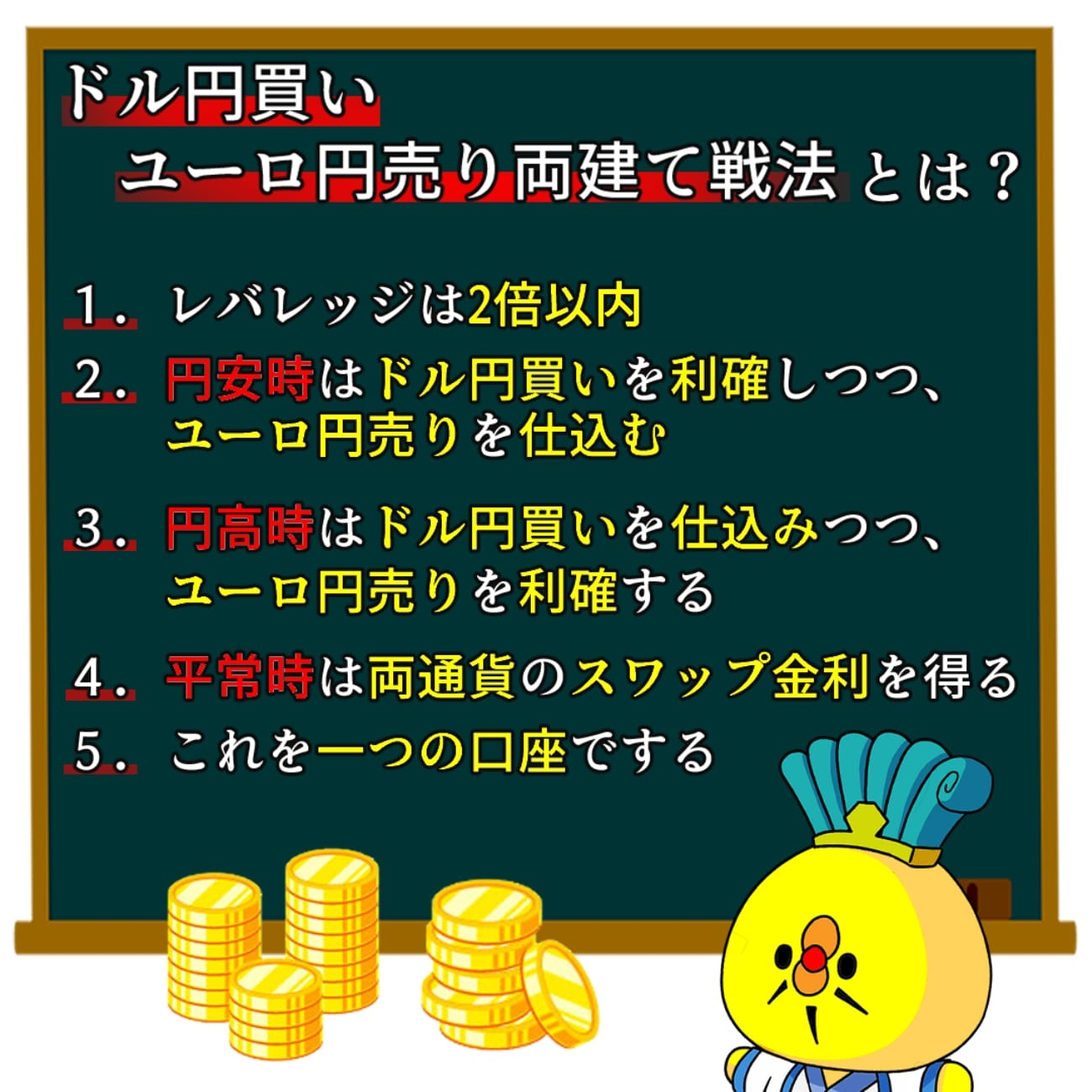 「ドル円買いユーロ円売り両建て戦法」をご紹介します。
