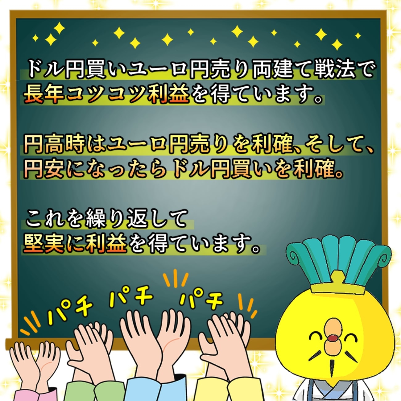 単にドル円買い、ユーロ円売りをしているだけだといわれたらそれまでですが、円や時はドル円決済で稼ぎ、平常時はスワップ金利で稼ぎ、円高対策としてユーロ円売りも有効ということで、コツコツ稼ぎ、損をしないトレードが実現できるのではないかと思います。